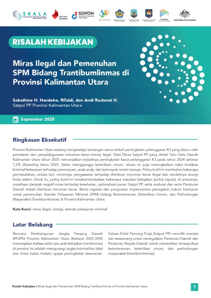 Provinsi Kalimantan Utara sedang menghadapi tantangan serius terkait peningkatan pelanggaran K3 yang dipicu oleh peredaran dan penyalahgunaan minuman keras (miras) ilegal. Data Dinas Satpol PP yang diolah Satu Data Daerah Kalimantan Utara tahun 2025 menunjukkan terjadinya peningkatan kasus pelanggaran K3 pada tahun 2024 sebesar 7,2% dibanding tahun 2023. Selain mengganggu ketertiban umum, situasi ini juga meningkatkan risiko tindakan kriminal/kekerasan terhadap perempuan, anak-anak, dan kelompok rentan lainnya. Policy brief ini membahas beberapa permasalahan, antara lain: minimnya pengawasan terhadap distribusi minuman keras ilegal dan rendahnya sinergi lintas sektor. Untuk itu, policy brief ini merekomendasikan beberapa masukan kebijakan (policy inputs), di antaranya: sosialisasi dampak negatif miras terhadap kesehatan, optimalisasi peran Satpol PP, serta evaluasi dan revisi Peraturan Daerah terkait distribusi minuman keras. Revisi regulasi dan penguatan implementasi penegakan hukum bertujuan untuk pemenuhan Standar Pelayanan Minimal (SPM) bidang Ketenteraman, Ketertiban Umum, dan Perlindungan Masyarakat (Trantibumlinmas) di Provinsi Kalimantan Utara.